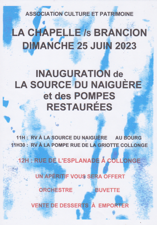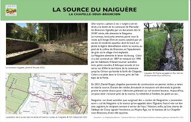 Une source canalisée depuis le XVIIIème siècle apparaît au pied de la colline de Brancion à la limite du village et alimente le Naiguère. Les bénévoles nettoient le sol de la sortie de la rivière et Daniel Roger, chapelon passionné, construit des abords en pierres sèches. Un panneau d’information répertorie les lavoirs, les pompes et les moulins autrefois alimentés par son passage.